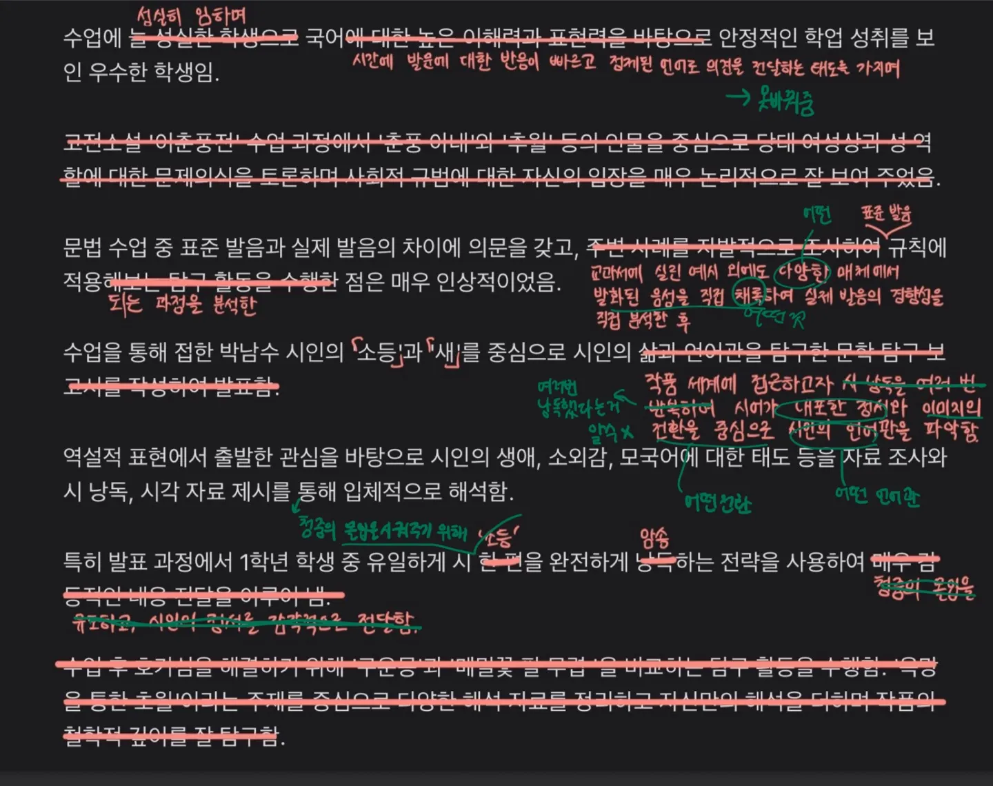 학교 선생님이 원래는 아예 안바꿔준다고 햇는데 내일까지 세 번째 줄에 구체적으로 어떤 것을 채록했는지 적고 관련된 증거자료도 하나 제출하고 네 번째 줄에는 저 말은 다른 시인들한테도 다 붙일 수 있는 말이어서 어떤 전환이 쓰였고 어떤 언어관을 가졌는지 자세하게 적어오면 반영해서 자기가 고쳐주겠다고 하셨어요